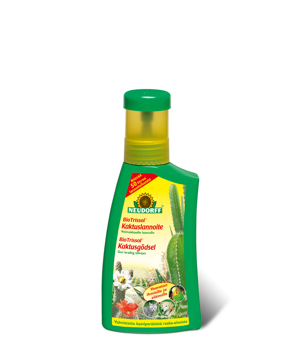 Bio Trissol Kaktuslannoite on erityisesti kaktuksille, aaloeille ja mehikasveille kehitelty sopiva, hieman miedompi ravinnetiiviste. Sopii myös paunikoiden, agaaveiden ja muiden karumpien olosuhteiden kasvien lannoittamiseen ja hoitoon. Kaktuslannoite on typetön, paljon kaliumia sisältävä ravinne hitaammin kasvaville mehikasveille. Ravitsee maan mikro-organismeja ravintoaineilla ja edistää näin luonnollista maaperän hedelmällisyyttä. Erityisen sopiva ravinneyhdistelmä hoitaa kasveja, ja tekee niistä vastustuskykyisempiä tauteja ja tuholaisia vastaan. Orgaaninen lannoiteliuos on tummanruskeaa ja kevyesti tuoksuvaa. Luonnosta peräisin olevat ainesosat ovat vaarattomia käyttää myös syötävien kasvien lannoituksessa.