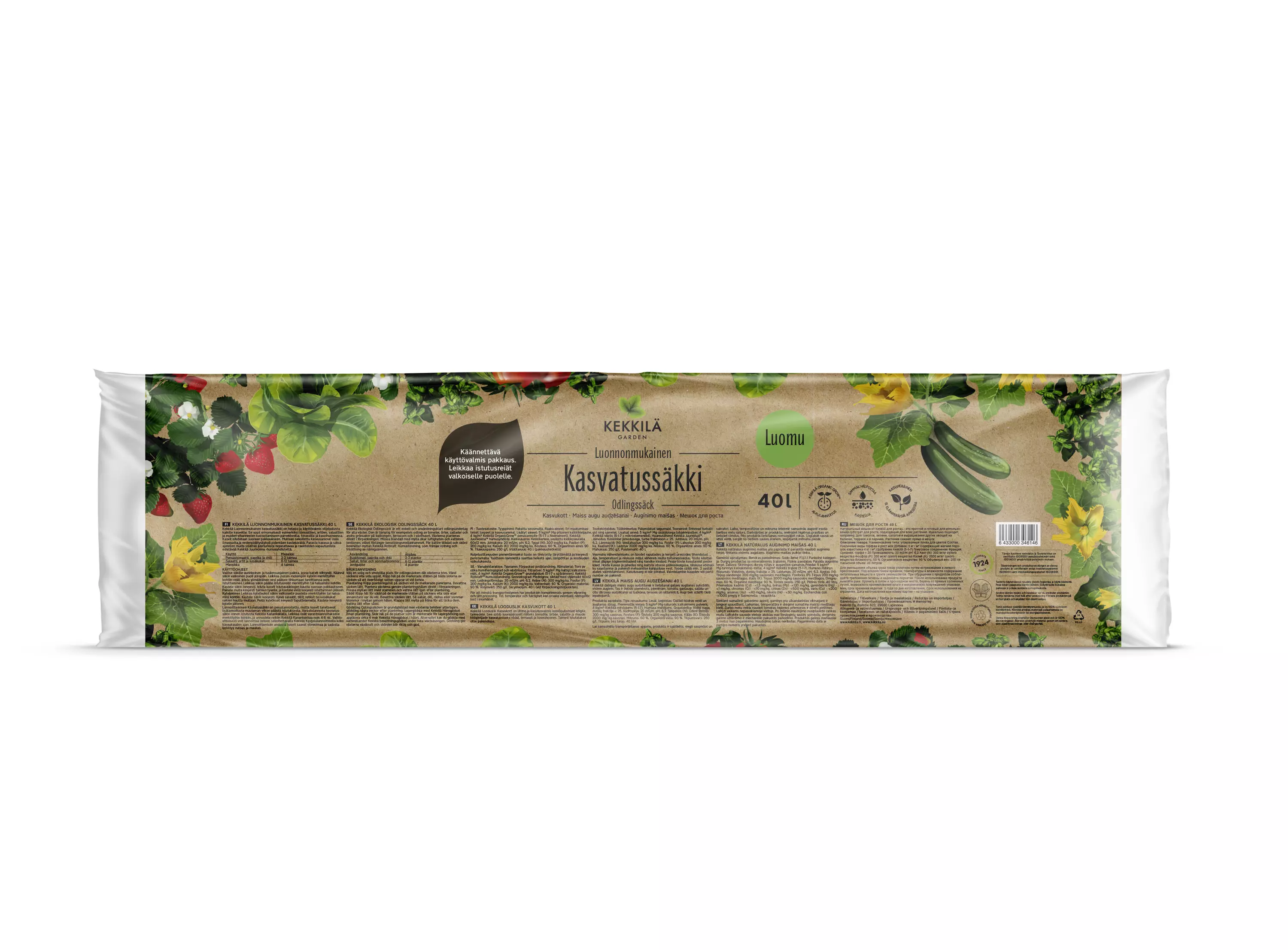 Kekkilä Luonnonmukainen kasvatussäkki on helppo ja käyttövalmis viljelyalusta kaikille kasveille. Se sopii erinomaisesti esimerkiksi tomaattien, yrttien, salaattien ja muiden vihannesten kasvattamiseen parvekkeella, terassilla ja kasvihuoneessa. Kasvit istutetaan suoraan pakkaukseen. Multaan sekoitettu kasvusammal lisää ilmavuutta, ja vedenpidätyskykyä pidentäen kasteluväliä. Parasta kasvua ja satoa ajatellen multa sisältää juurtumista nopeuttavaa ja ravinteiden vapautumista edistävää Kekkilä Juurivoima -humusyhdistettä. Kasvatussäkki on lannoitettu luonnonmukaisella kasviperäisellä Kekkilä OrganicGrowTM lannoitteella. Ei sisällä eläinperäisiä ainesosia