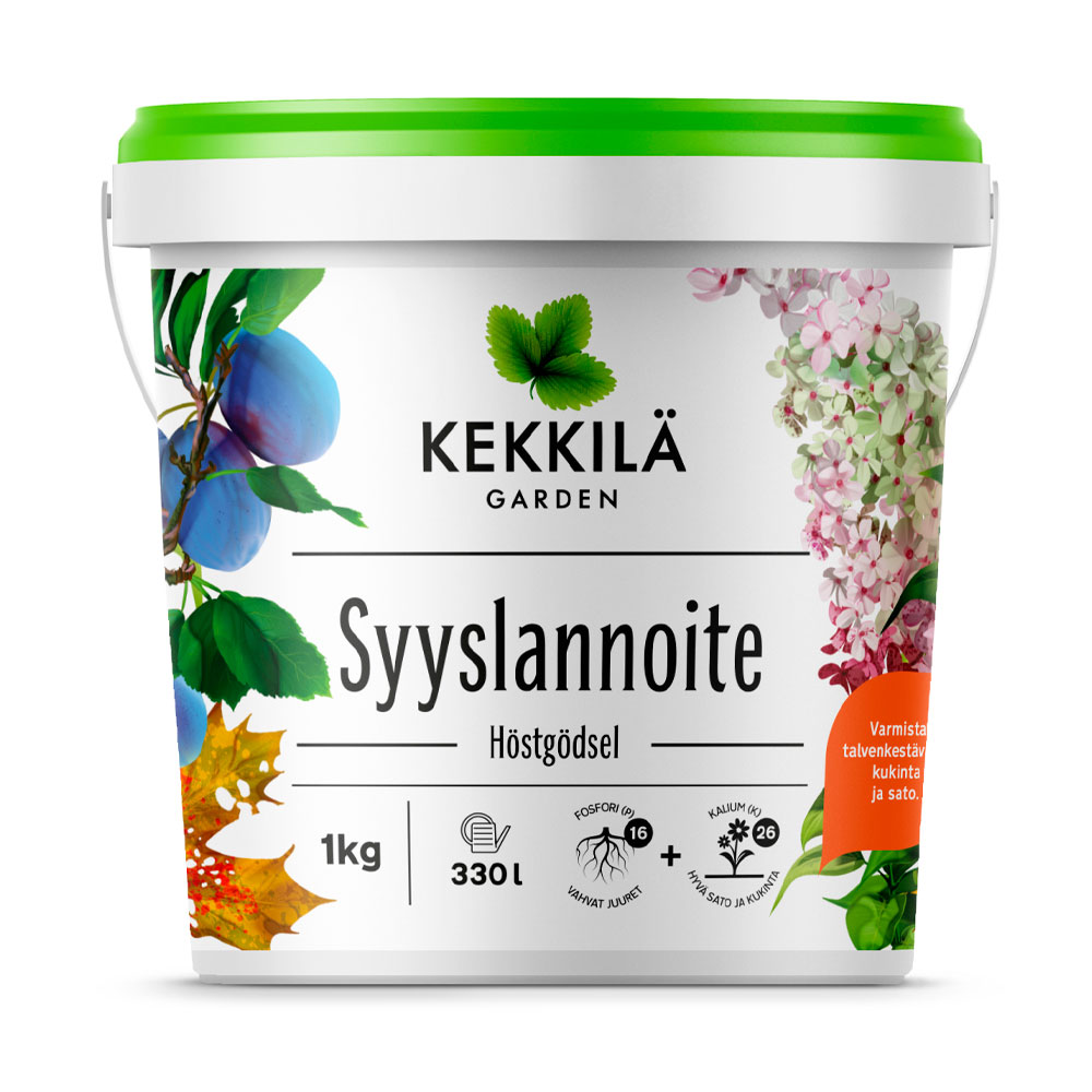 Kekkilä Syyslannoite on kasteluveden mukana annettava erikoislannoite kaikille kotipuutarhan kasveille. Se on typetön ja sisältää runsaasti fosforia, kaliumia ja hivenaineita. Syyslannoite auttaa kasveja talvehtimaan ja takaa seuraavan vuoden kasvun ja kukinnan. Kasvien kylmänkestävyys ja ravinteiden käyttökyky paranee syksyllä lannoittamalla. Veteen sekoitettava Syyslannoite annetaan elo-syyskuussa puille, pensaille sekä marja- ja hedelmäkasveille. Paras vaikutus saadaan kun Syyslannoite annetaan ennen lehtien kellastumista, näin kasvit siirtyvät talvilepoon oikeaan aikaan.