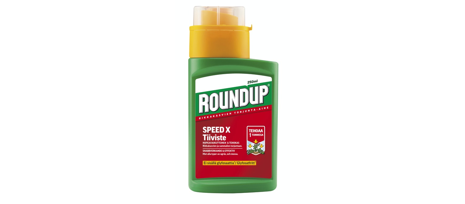 Roundup Speed X nyt myös tiivisteenä! Roundup Speed X on tehokas rikkakasvien torjunta-aine. Käytetään rikkakasvien ja sammaleen torjuntaan kulkuväyliltä ja viljelemättömiltä alueilta sekä koristekasvien alustoilta ja riviväleistä avomaalla. Tuote on riittoisa ja nopeatehoinen: jopa yhdessä tunnissa näkyviä tuloksia. Tehoaa yleisimpiin rikkakasveihin. Vain tehoaineella ruiskutetut kasvinosat kuolevat. Tuote ei sisällä glyfosaattia.