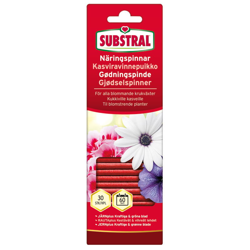 Substral Ravinnepuikot kukkiville kasveille ravitsevat ja antavat elinvoimaa kasveille tasaisesti kahden kuukauden ajan. Ravinnepuikot kukkiville kasveille sisältävät yhdistelmän arvokkaita pääravinteita ja hivenravinteita, jotka lannoittavat kasveja tasaisesti kahden kuukauden ajan. Terve kasvi on puolustuskykyisempi tuholaisia ja tauteja vastaan.