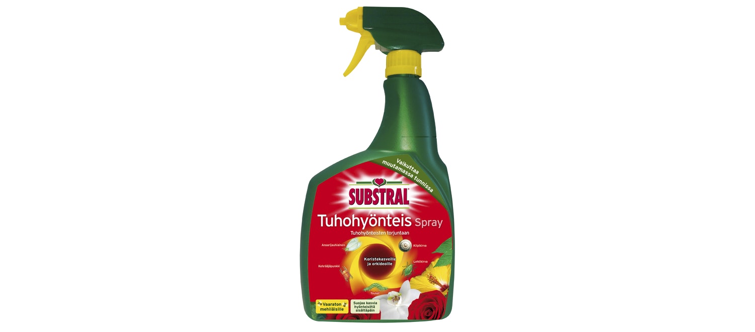 Substral Tuhohyönteisspray on käyttövalmis tuhohyönteisspray koristekasveille. Torjuu kasveja imeviltä ja purevilta tuholaisilta. Tehoaa esimerkiksi ansarijauhiaisiin, kehrääjäpunkkiin, kilpikirvoihin, lehtikirvoihin ja näiden toukkiin sekä muniin. Systeeminen vaikutus suojaa kasvia myös sisältäpäin. Vaikuttava aine imeytyy lehtiin ja leviää nestekierron mukana kaikkialle kasviin. Tehokas torjunta-aine tuhoaa pehmeäkuoriset tuhohyönteiset (esim. papukirvat) usein yhdellä käsittelyllä, mutta useampaa käsittelyä suositellaan parhaan tuloksen saavuttamiseksi. Käyttövalmis tuhohyönteisten torjunta-aine. Helppokäyttöinen sumutespray-pullo.