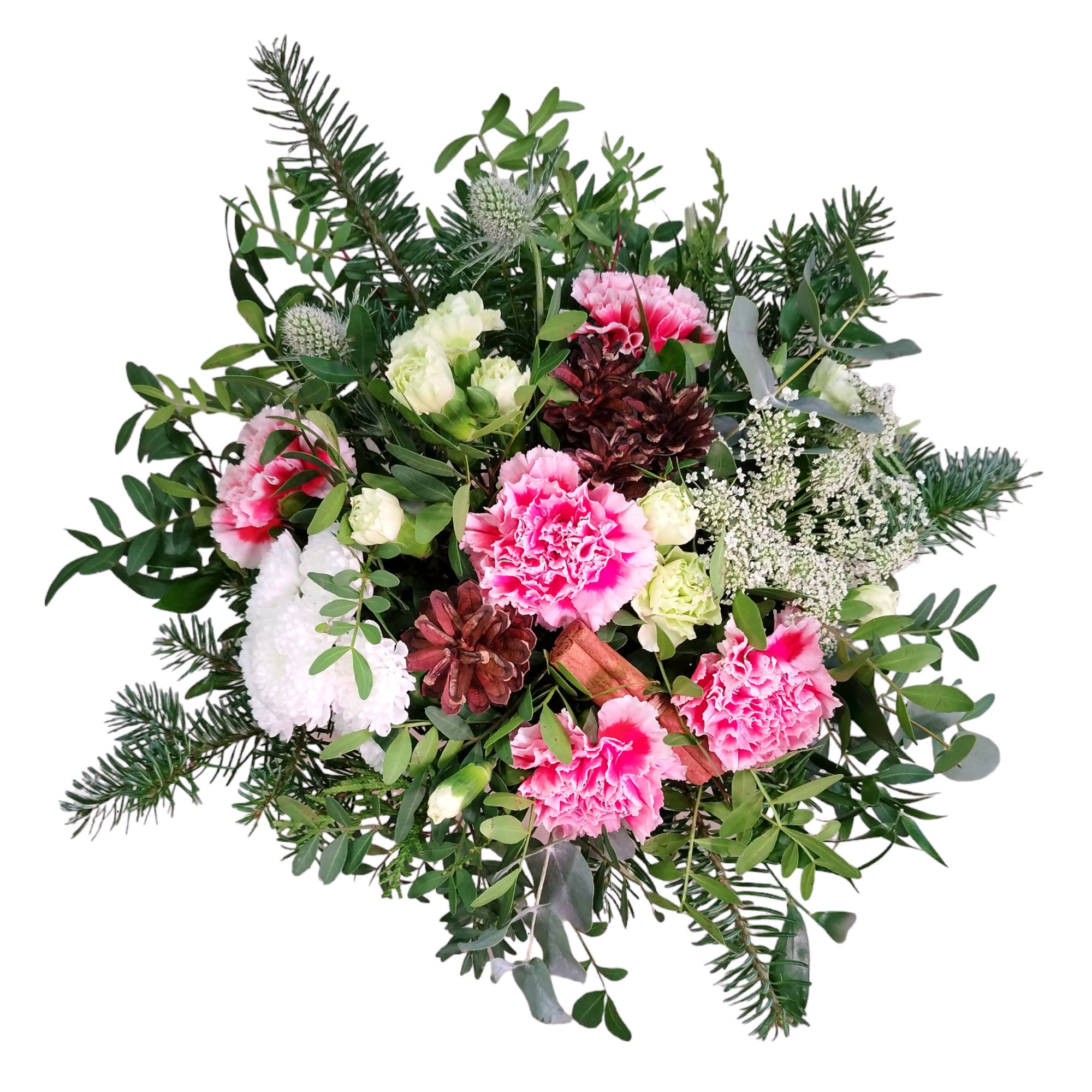 Kaunis vaalean sävyinen leikkokukkakimppu sidotaan puhtaan valkoisista ja limen sävyisistä neilikoista. Kimppua koristavat hurmaavat männynkävyt ja kanelitangot.
