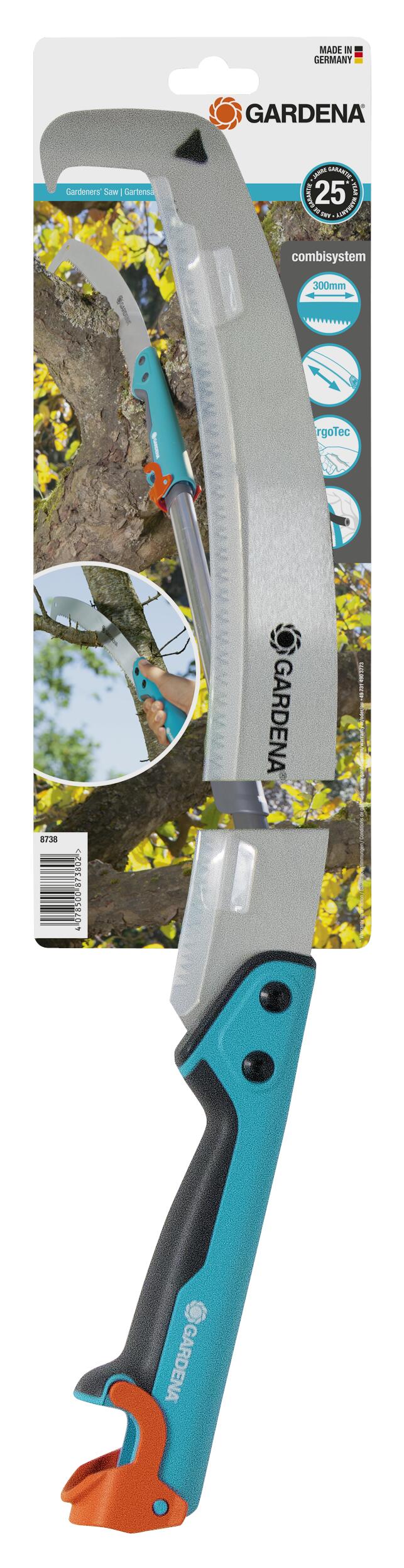 Kaarevan GARDENA combisystem -puutarhasahan terän pituus on 315 mm. Saha on joustava käytössä käyttöpaikan mukaan: jos haluat sahata helposti tavoitettavia oksia, käytä puutarhasahaa "normaalina" käsisahana. Saha istuu mukavasti käteen ergonomisen kahvan ansiosta, jonka muoviosat ovat mukavan pehmeitä.