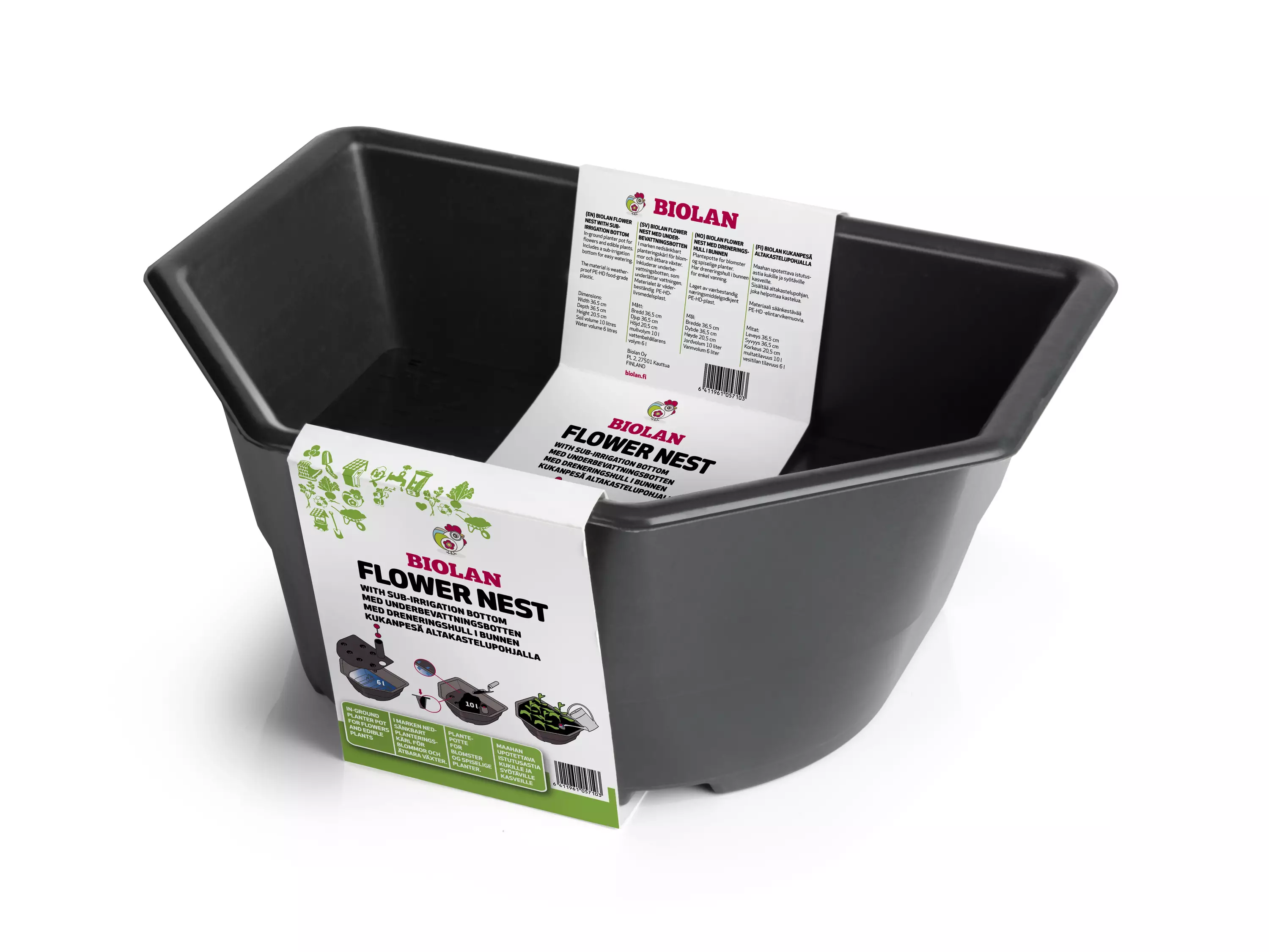 Kukanpesän pohjalla on vedenpoistoreiät – pohjalle jää kuitenkin noin 6 litran vesitila vähentämään kastelutarvetta. Multatilavuus Kukanpesässä on 10 litraa.