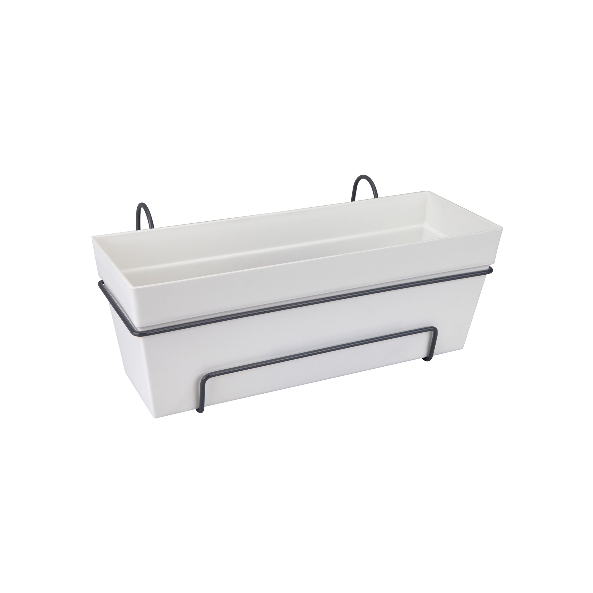 Suoralinjainen parvekelaatikko välipohjalla ja pidikeraudoilla. Koko paketti valmiina asennettavaksi parvekkeen kaiteelle tai aidan reunalle. Valmistettu kierrätetystä muovista tuulienergialla Hollannissa.