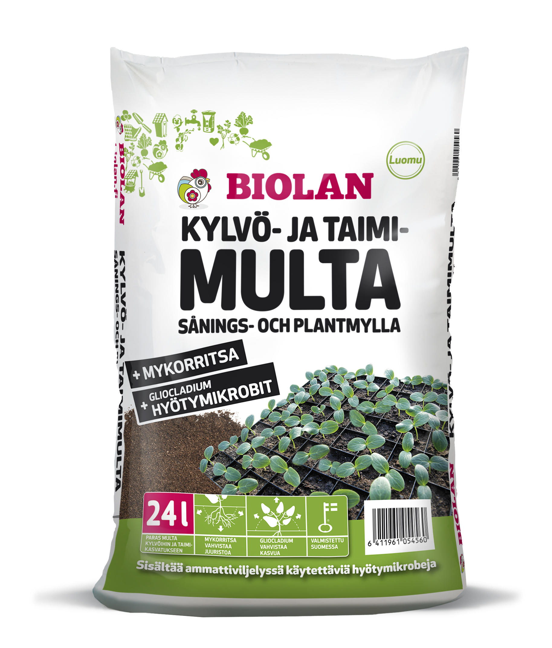 Biolan Kylvö- ja taimimulta on hienojakoinen multaseos, joka on suunniteltu erityisesti kylvöihin ja taimikasvatukseen. Kylvö- ja taimimulta soveltuu myös luomukasvatukseen.