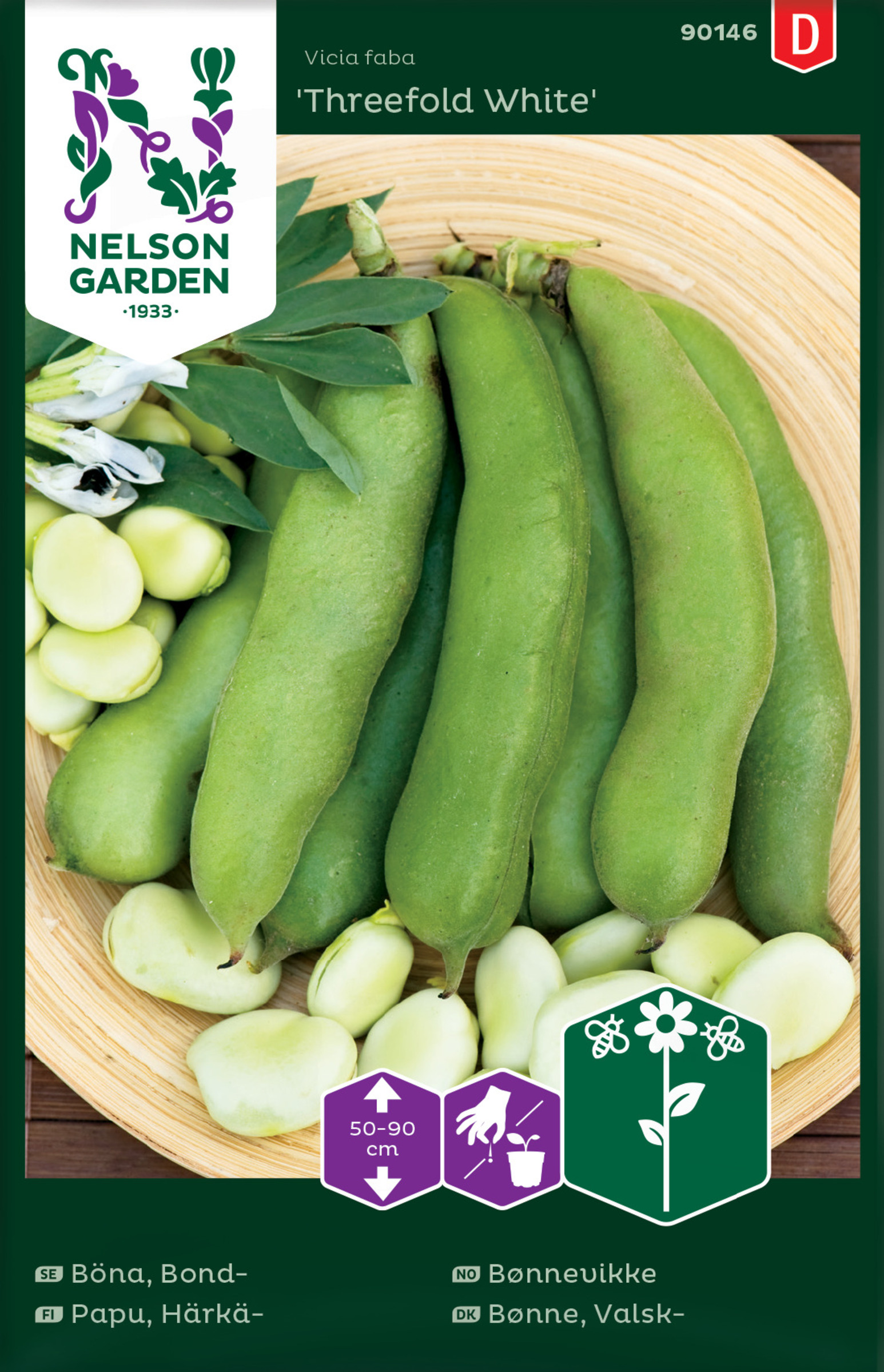 Härkäpapu 'Threefold White' on yksivuotinen hyötykasvi. Annossiemenpussi.