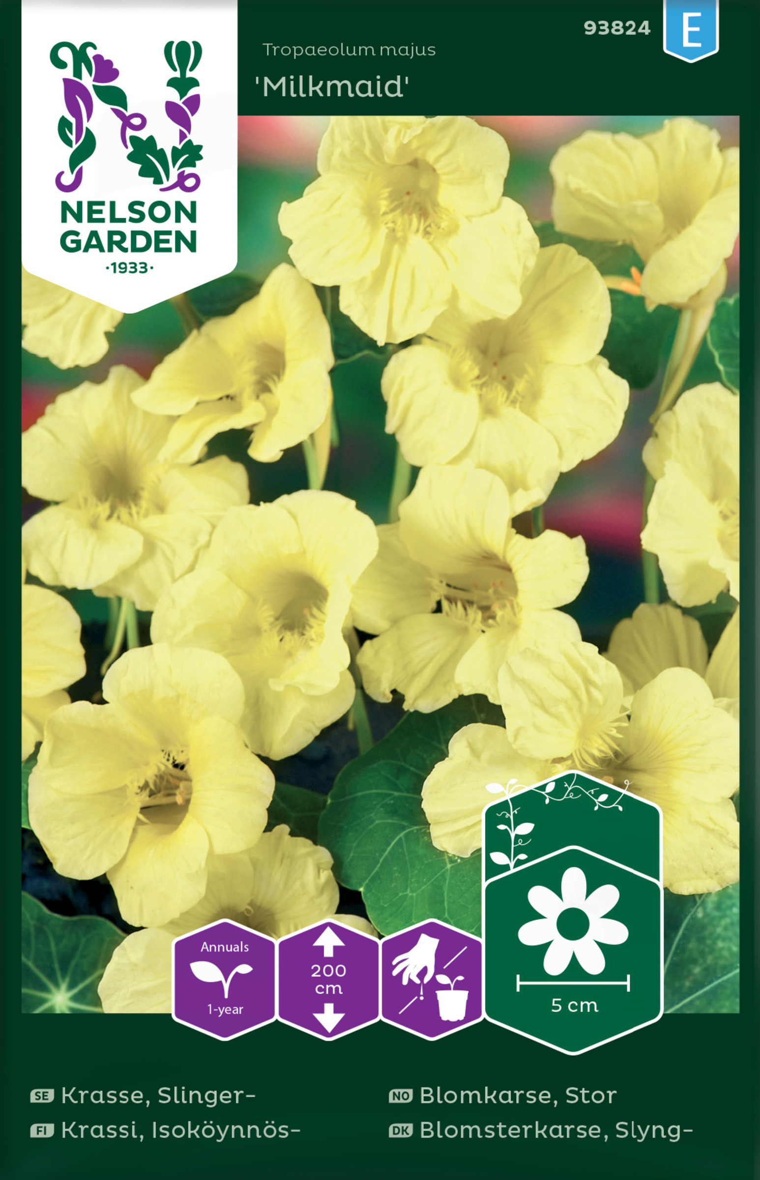 Isoköynnöskrassi 'Milkmaid' on yksivuotinen koristekasvi. Annossiemenpussi. Kauniin kermansävyinen, keskiosastaan keltainen kukka. Sopii hienosti tummempien kasvien seuraksi esim. amppeliin... Lue lisää