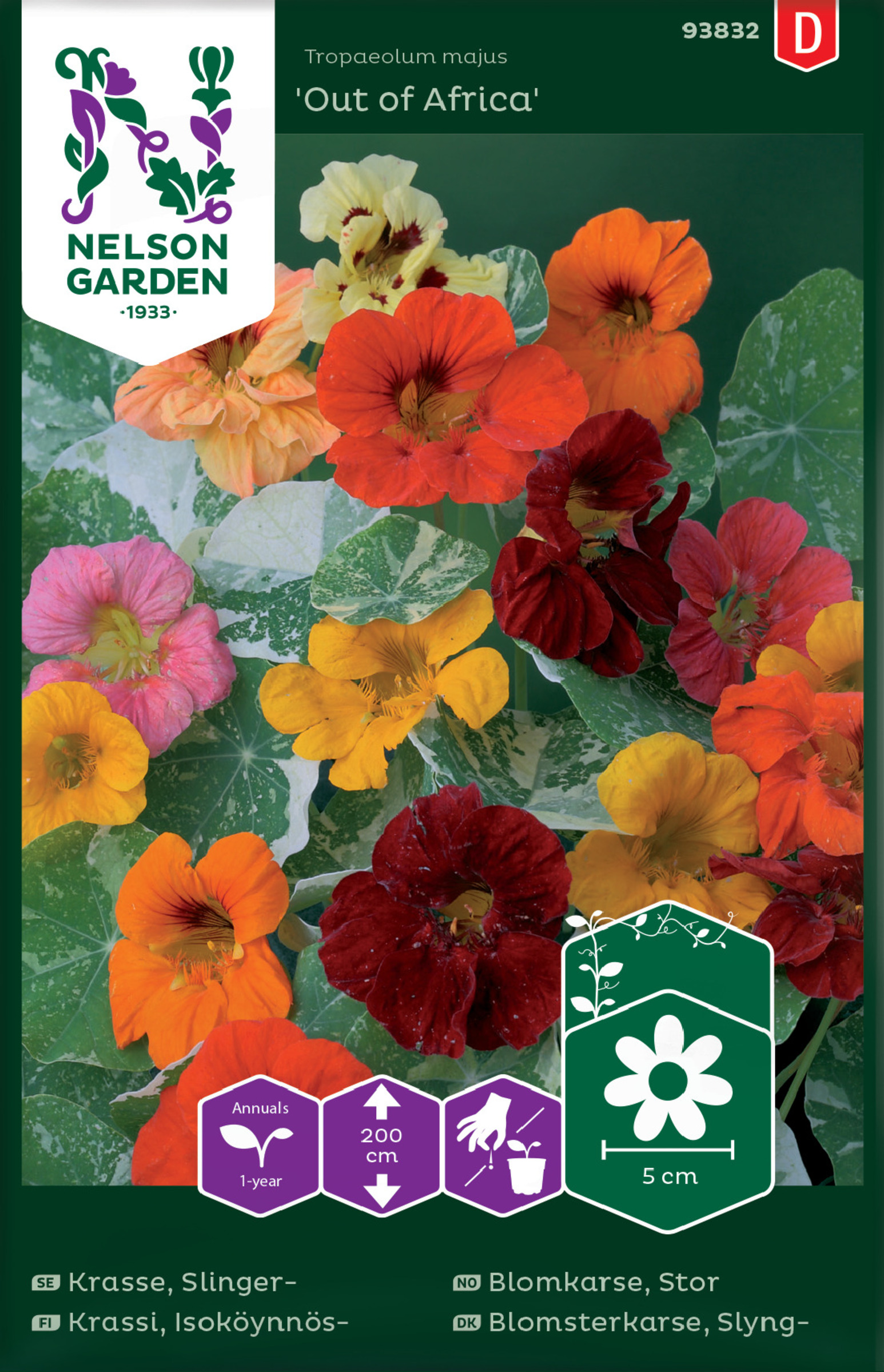 Isoköynnöskrassi 'Out of Africa' on yksivuotinen koristekasvi. Annossiemenpussi. Köynnöstävä krassi, valkojuovaiset lehdet ja keltaisen, oranssin ja punaisen sävyiset kukat. Sopii amppeliin... Lue lisää