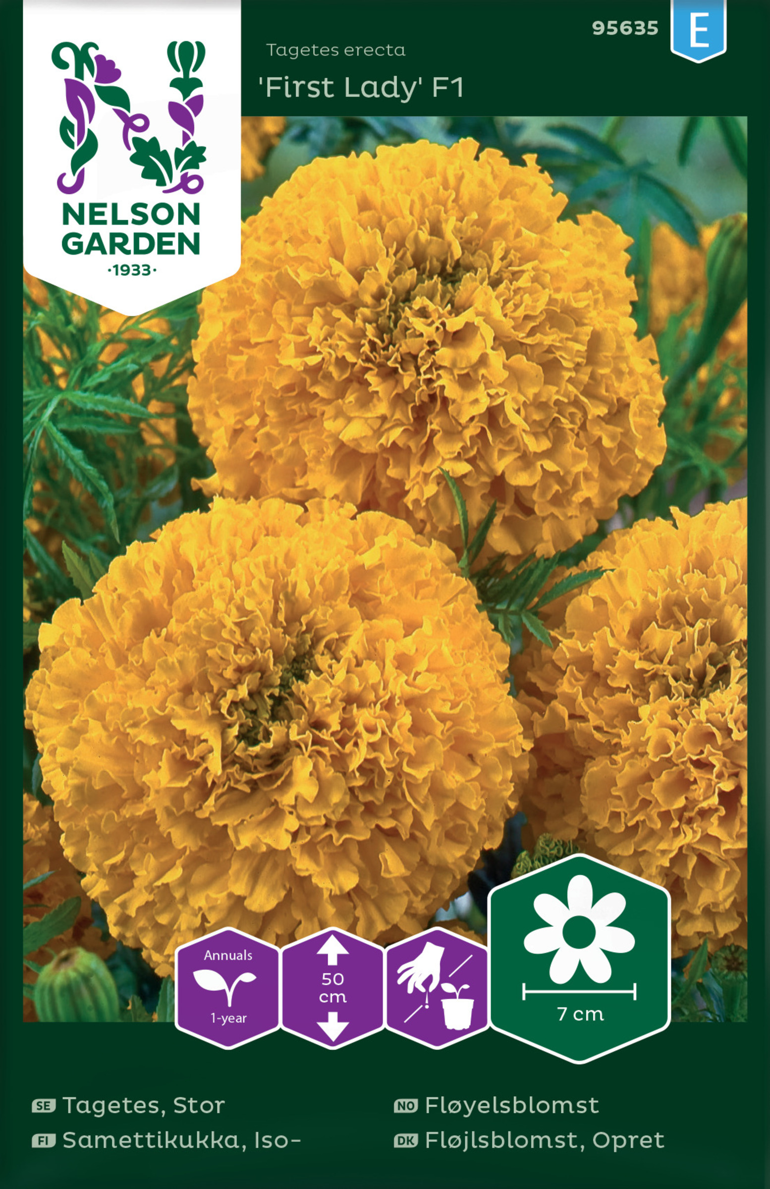 Isosamettikukka 'First Lady' on yksivuotinen koristekasvi. Annossiemenpussi. Kasvattamisenarvoinen, kaunis ulkokasvi. Suuret, täyteläiset, pallomaiset kullankeltaiset kukat. Kukkii runsaasti koko... Lue lisää