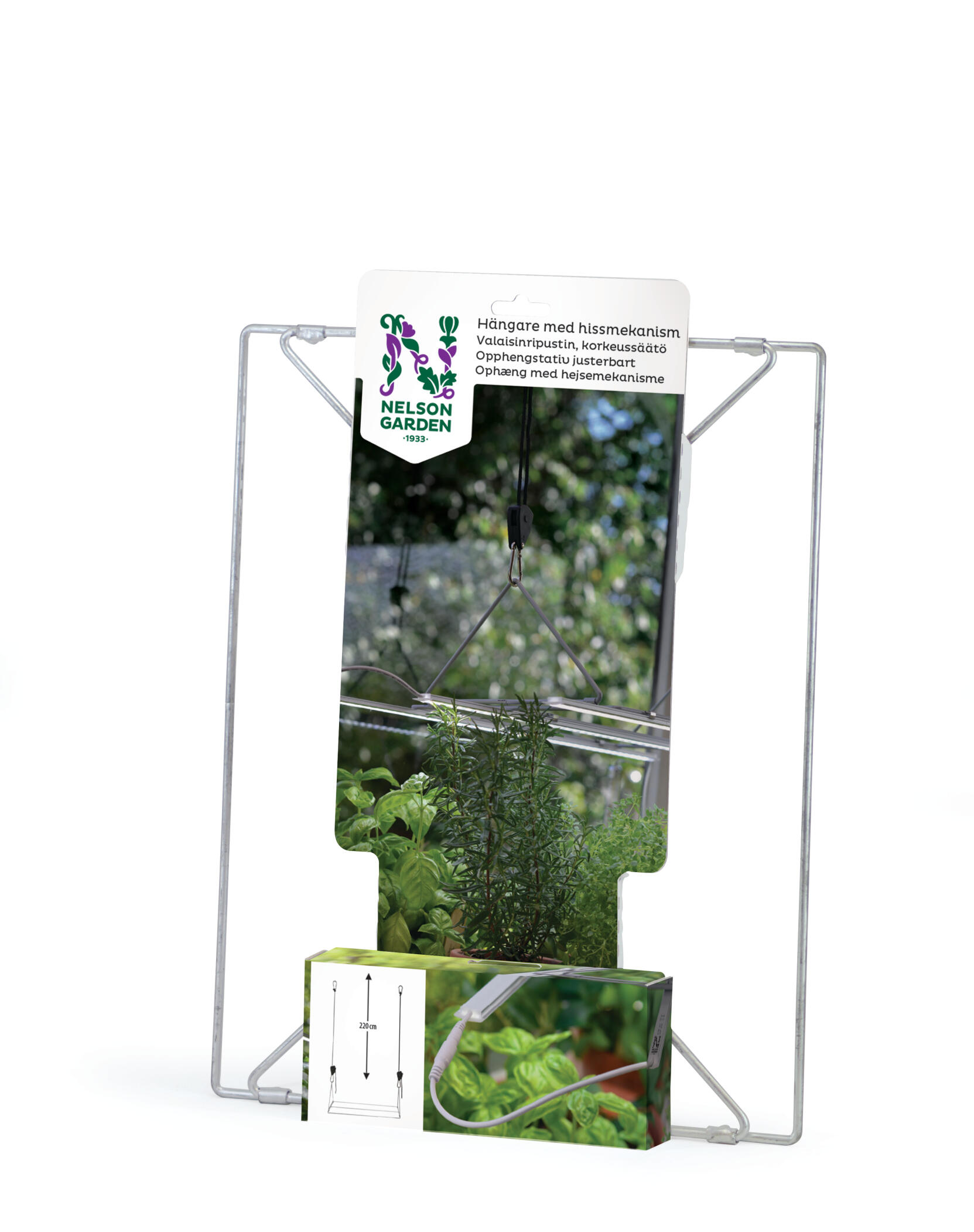 Fiksu ripustusvaihtoehto jopa kolmelle kasvivalaisimelle. Korkeutta säädetään hissimekanismin avulla taimien kasvaessa. Metallia. 40x32cm. Naru polypropeenia (PP) 220cm. Max kuormitus 2kg. Tuotenumero 5606.