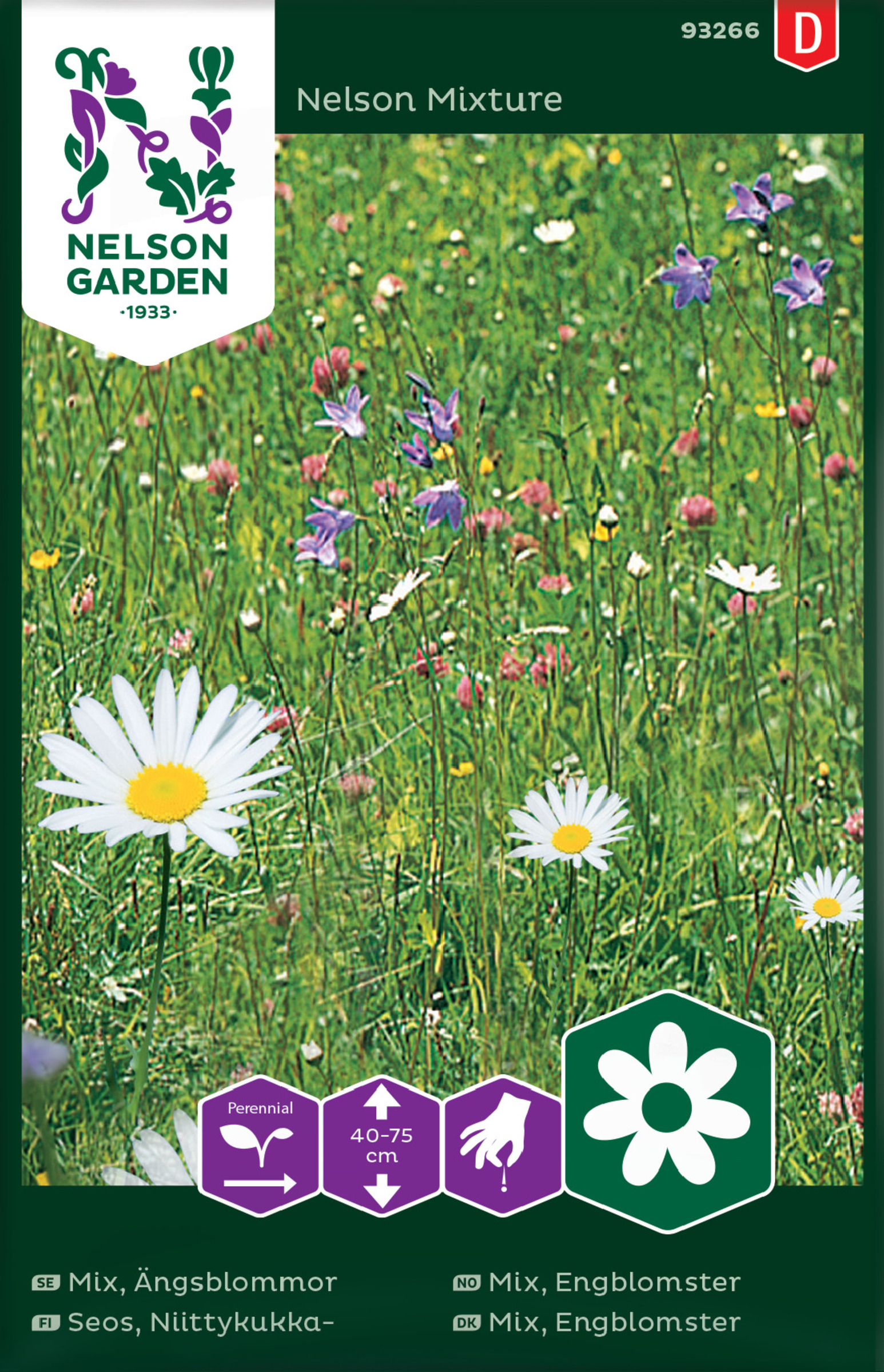 Seos perinteisiä niittykukkia, mm. apilaa ja ruiskaunokkia. Kukkien kasvupaikkavaatimuksissa on eroa, ja kullekin paikalle valikoituvat siinä viihtyvät kasvit. Loppukesällä kukat siementävät. Vältä lannoittamista.