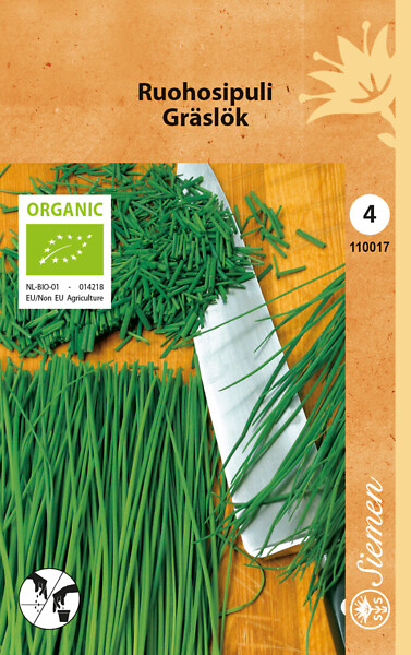 Ruohosipuli, annossiemenpussi. Kylvö huhtikuussa sisälle ruukkuun, avomaalle touko-kesäkuussa. Ruohosipuli lehdissä on hieno aromi ja mieto sipulin maku. Kauniin pyöreät, syötävät lilat... Lue lisää