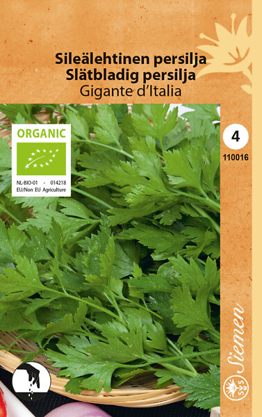Sileälehtinen persilja ´Gigante d´Italia´, annossiemenpussi. Voimakkaampi maku, kuin poimulehtisillä lajikkeilla. Kylvö avomaalle touko-kesäkuussa. Voidaan korjata 5 cm:n mittaisesta asti. Maa... Lue lisää