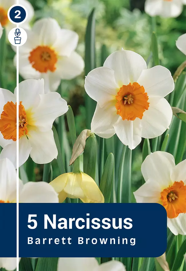 'Barrett Browning' -lajike hurmaa valkoisin kukin. Kirkkaan valkoiset kukat kirkkaan oranssilla torvella ovat komeat ja näyttävät. Sipuli ei maistu myyrille tai jäniksille. Kasvi on lievästi myrkyllinen.