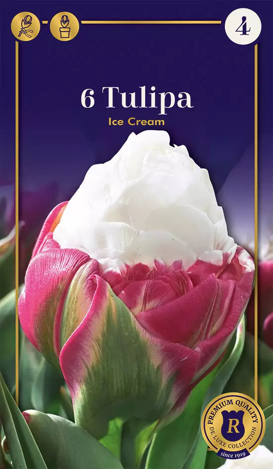 TOIVOTTU UUTUUS! Hurmaava uutuustarhatulppaani 'Ice Cream' on kuin kesän ensimmäinen jäätelö! Muhkea valkoisten terälehtien täyttämä keskus on verhoiltu upeilla pinkeillä reunusterälehdillä. Tämä jätski kukkii alkukesällä näyttävästi ja viihtyy auringossa sulamatta. Erikoisen väriset ja näyttävät kukat piristävät puutarhaa ja ruukkuistutuksia. Matalahkon lajikkeen tukevat varret jaksavat hyvin kannatella suuret, kerrotut ja muhkeat kukat. Erityisen kaunis lajike esimerkiksi tummanvihreitä havuja vasten. Pionin lailla avautuva lajike on parhaimmillaan muhkeana ryhmänä. Kestävä ja sopii myös leikkokukaksi.