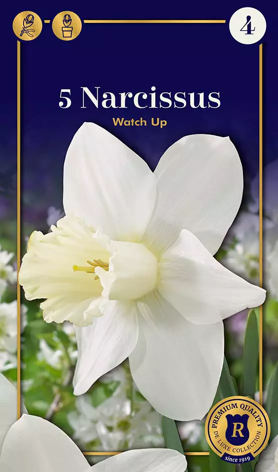'Watch Up' -lajikkeen isotorvinen kukinto valaisee puutarhaa puhtaanvalkoisin kukin. Kukkien keskellä on viehättävä, röpelöreunainen torvi, joka on sävyttynyt erittäin hennon vaaleankeltaiseksi. Erittäin kaunis uutuuslajike! Sipuli ei maistu myyrille tai jäniksille. Kasvi on lievästi myrkyllinen.