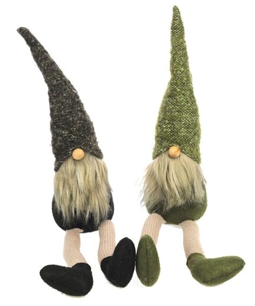 Istuva parrakas tonttu. Nutun ja lakin värivaihtoehtoina musta ja vihreä.