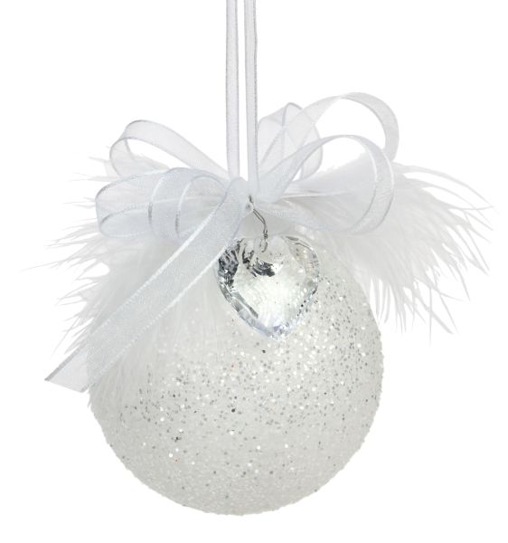 Valkoisella hileellä päällystetty joulupallo sydän koristeella.