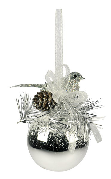 Hopeinen joulupallo, jota koristaa pieni käpy ja kimallelintu. Materiaali: muovi.